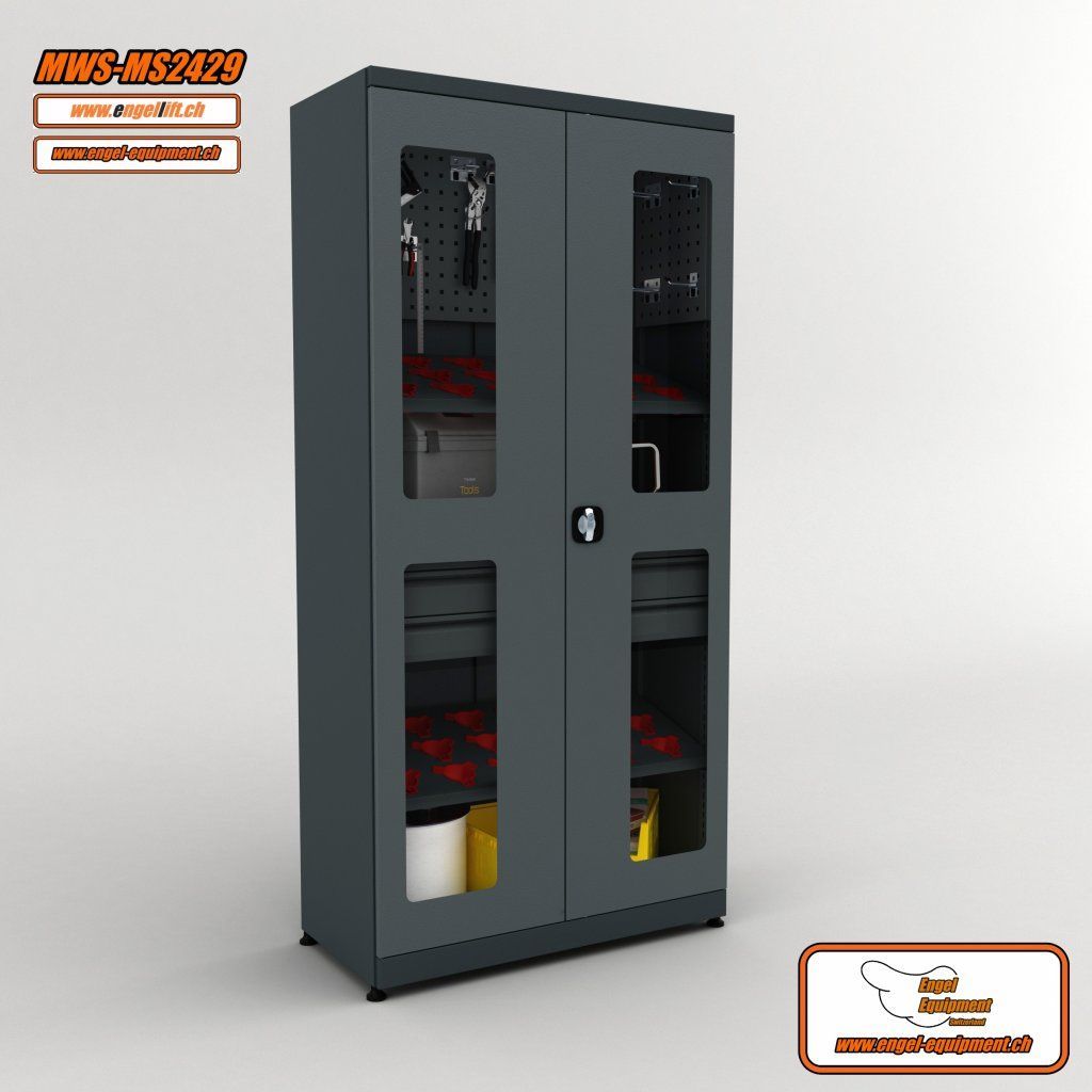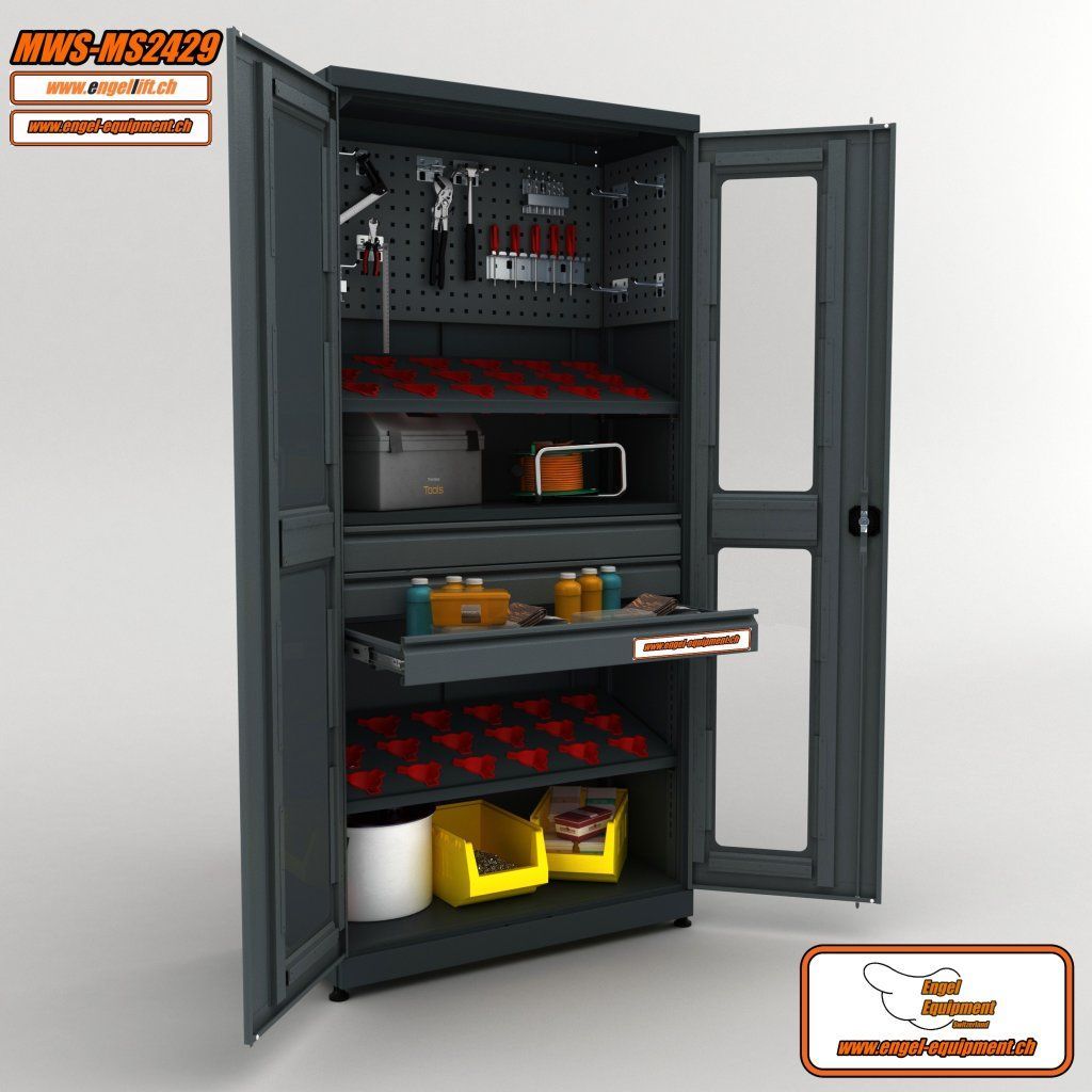 MWS-MS2429 MATERIAL SCHRANK MIT 2 TABLARE, 3 SCHUBLADE, CNC WERKZEUG HALTERN, LOCHBLECHWÄNDE & DURCHSICHT TÜREN