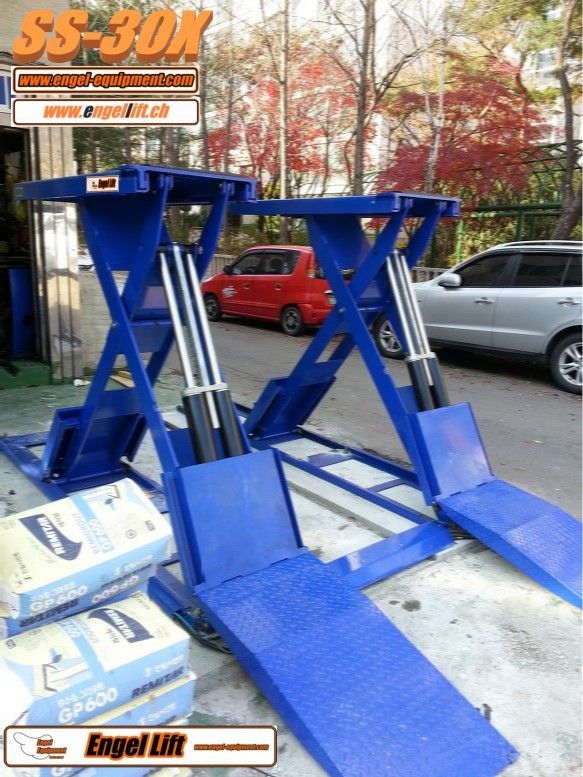 Sehr niedrige Aufbau Doppelscheren Hebebühnen vollhydraulisch mit 3.500kg Hubleistung, und nur 100mm eigen Aufbauhöhe.