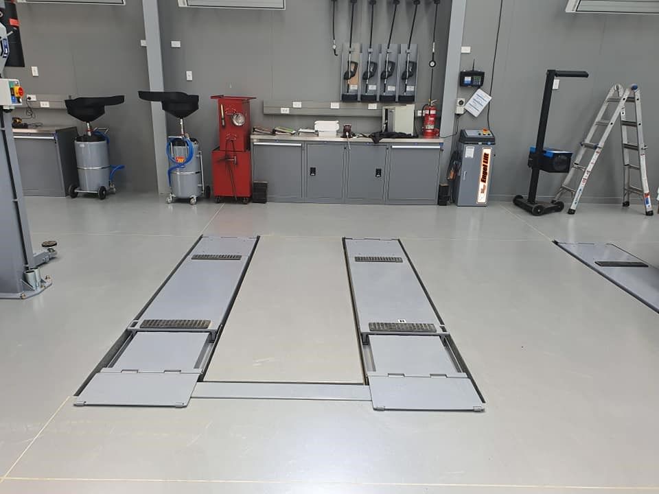 Halb-Scherenhebebühne mit Rafdrei Hubsystem und Achsvermessung Fahrbahnen.