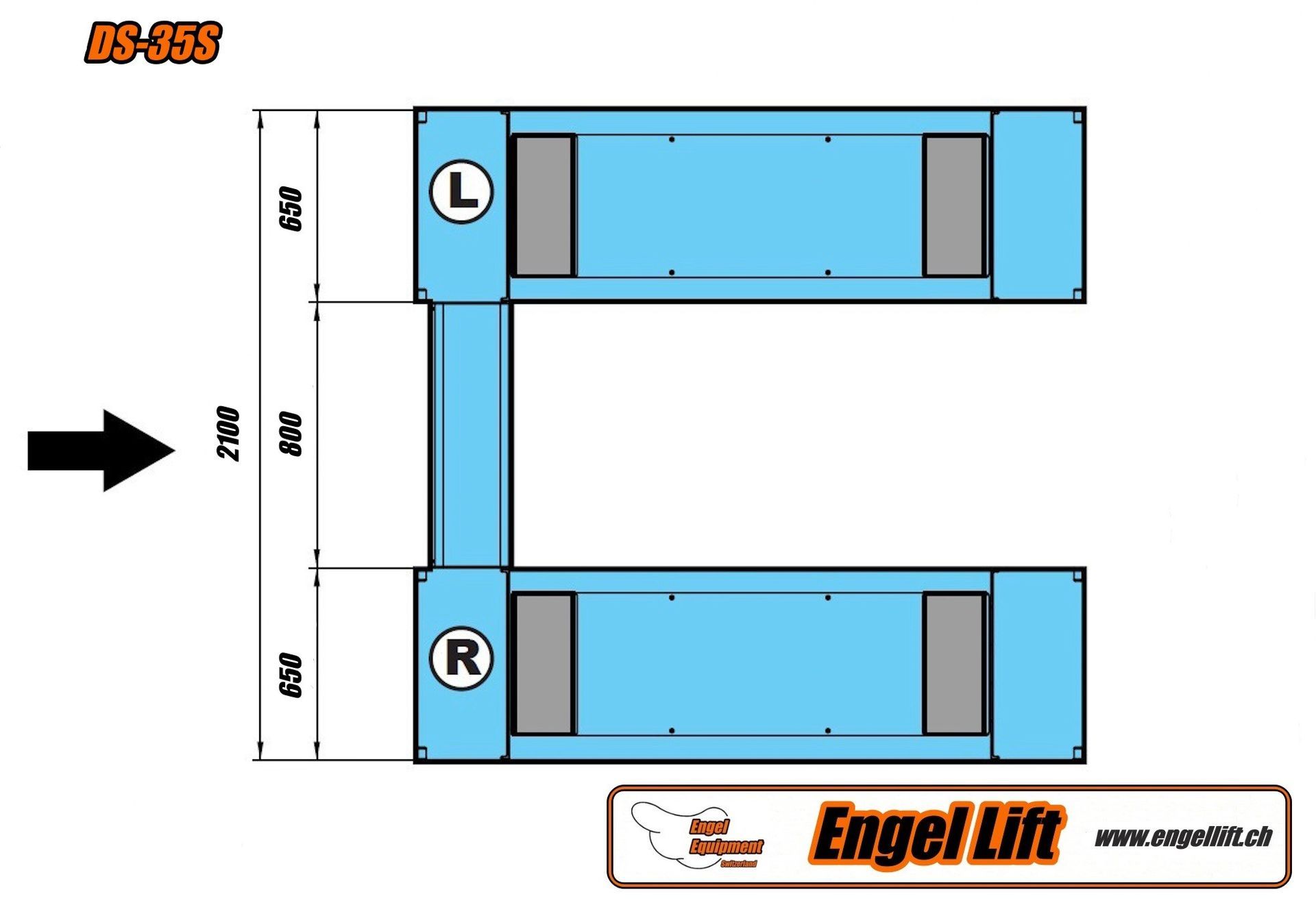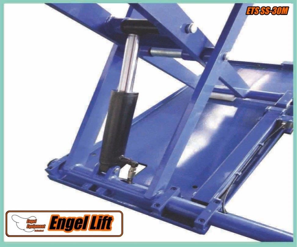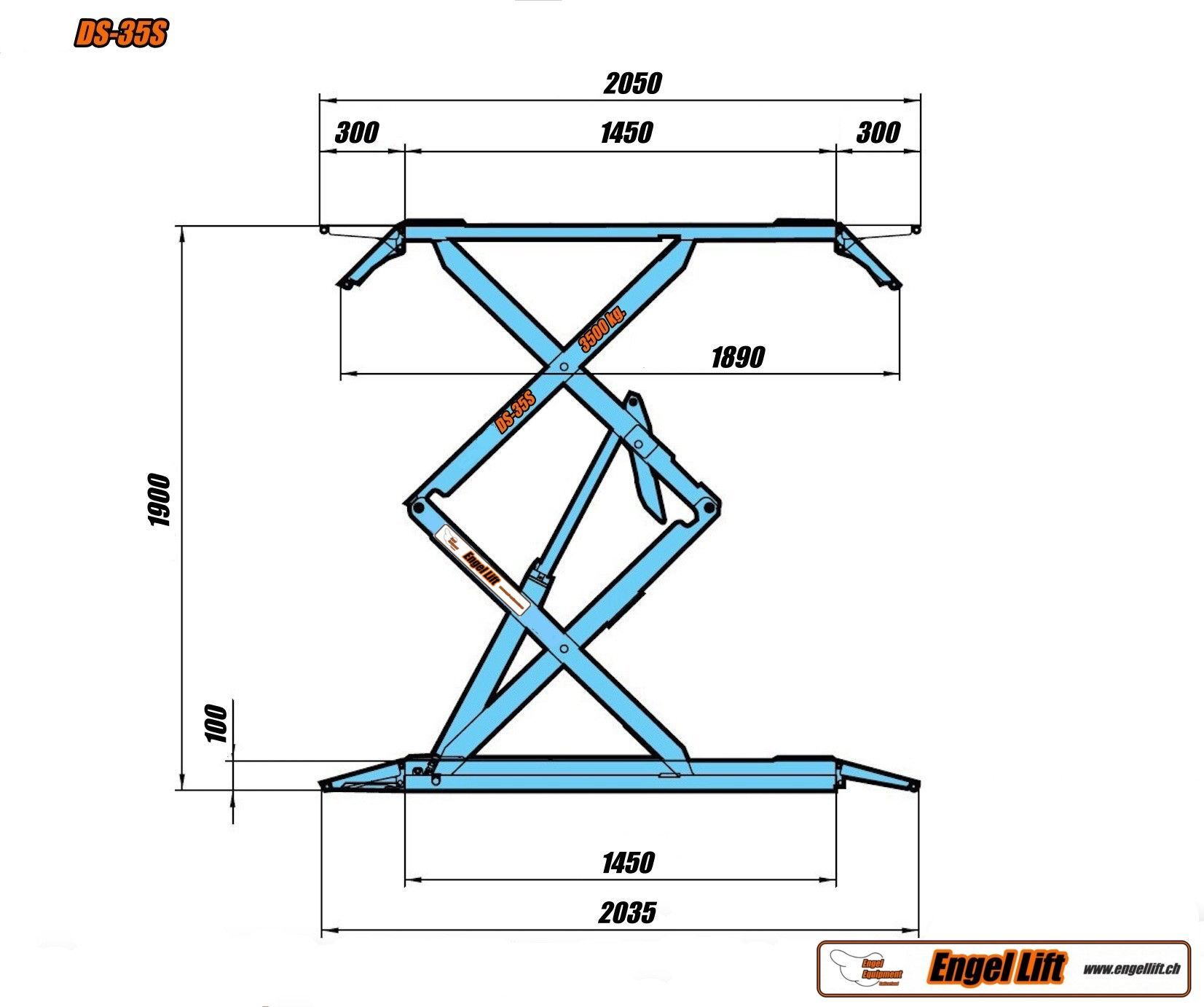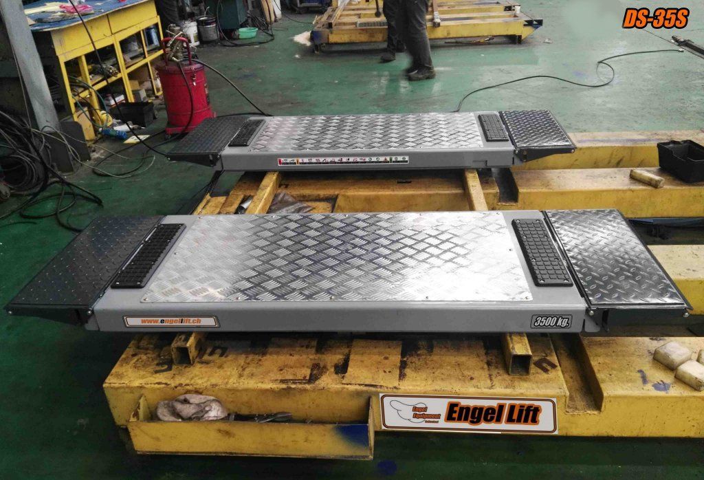 Der DS-35S hat ingesamt 4 dunne Hydraulische Zylinder, jede Schereneinheit hat dual-drive Zylinder (2), mit dazwischen der Verriegelung Zahnstange alles eingefasst in ein Blechabdeckung ,Mechanische Sicherung pneumatisch gesteuert, Hebebühne beidseitig befahrbar, vorwärts/rückwärts (es ist keine Auffahrtsrichtung zu beachten), Auf-/Abfahrrampen (300 mm & 300 mm), klappbar, für die Verlängerung der Aufnahmefläche auf gesamt 2050mm trozdem mit de volle 3500kg Belastbar, Hydraulischer Gleichlauf der Fahrbahnen überwacht durch Sicherheit-Drosselrückschlag sowie Überlastventil, versehen von Akustisches warnsignal für den letzten Senkabschnitt.