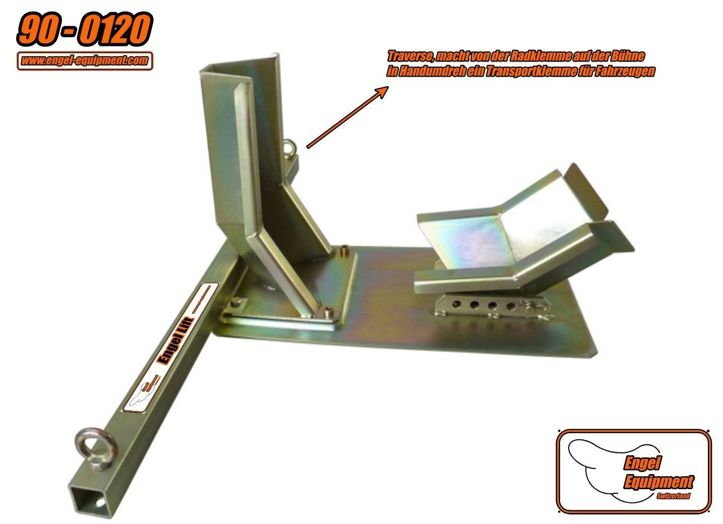 Traverse anschrauben mittels zwei schrauben an der 90-0100 Automatische Radklemme, macht dan der Radklemme insetzbar in jeder Fahrzeug für ein sichere Töfftransport mit an der enden der Traverse zwei angurt ésen.
